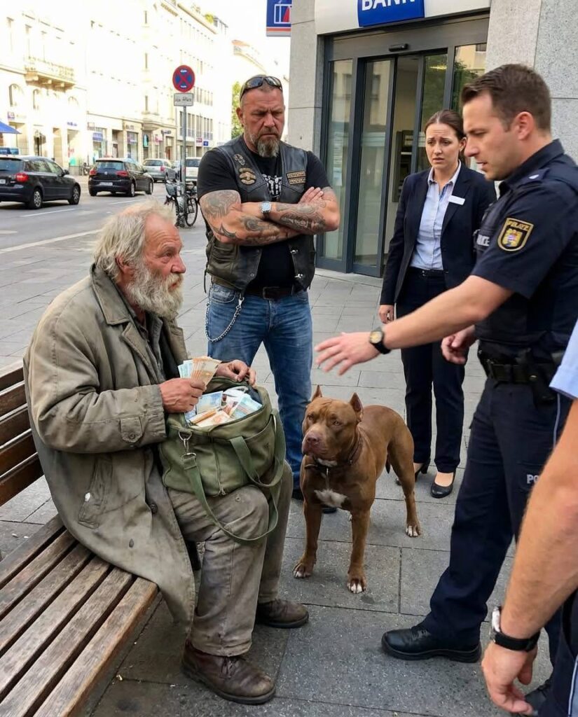 An old white man, maybe late seventies, thin frame wrapped in a worn brown coat, sitting just outside the glass doors of a downtown bank.