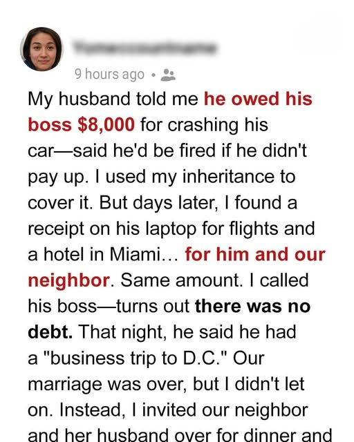 The document detailed two round-trip tickets and an eight-day hotel stay. The second name on the reservation wasn’t mine; it belonged to Sarah, our neighbor. Sarah was the kind of woman who was always “friendly,” perpetually borrowing sugar and chatting about her children over the garden fence. The total cost of this betrayal? Exactly $7,983—nearly the precise amount Mike had “needed” for his nonexistent car accident. A quick call to his boss confirmed my suspicions: there had been no crash. Mike hadn’t just broken my heart; he had robbed me to fund a luxury getaway with another man’s wife.